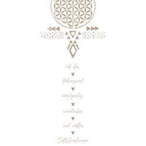 Auch das Motiv auf der Vorderseite ist die Blume des Lebens. Dieses uralte Schutz- und Energiesymbol kann deine Lebenskraft positiv stärken und helfen, deine innere Harmonie fördern.