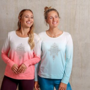 Dieses lockere Langarmshirt ist aus einem ganz weichen, kuschelig anschmiegsamen Stoff aus Bambus-Viskose und Biobaumwolle mit 5% Elasthan. Dadurch ist es leicht dehnbar. Die Arme und auch die Länge des Oberteils sind angenehm lang. Zudem hat das Shirt eine leicht überschnittene Schulterpartie und eine optimale Passform. Durch seinen Farbverlauf und den wunderschönen Ethno Aufdruck als Highlight in schillerndem Silber ist es vielseitig kombinierbar und passt so perfekt zu allem! Als liebevolles Detail hat das wunderschöne Shirt einen Innendruck mit Blume des Lebens und positiven Affirmationen.