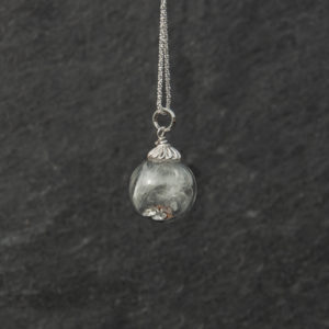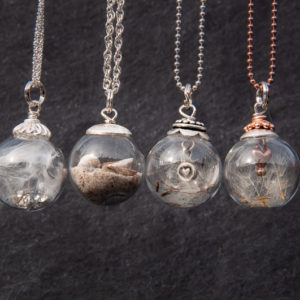 Die Muranoglaskugeln, die ich zukaufe, sind oben offen und werden von mir durch ein kleines Loch mit der Pinzette befüllt. Verschlossen werden sie durch einen von mir hergestellten Deckel aus Silber, der die Aufhängung für die Kugel ist. Es gibt sie auch noch mit Pusteblumen, mit Muscheln oder deiner Wunschfüllung! Das Glas ist nicht mehr und nicht weniger empfindlich als anderes Glas auch. Und beim Tragen sind die herzigen Chüegelies ja auch meist noch durch den Busen geschützt 🙂