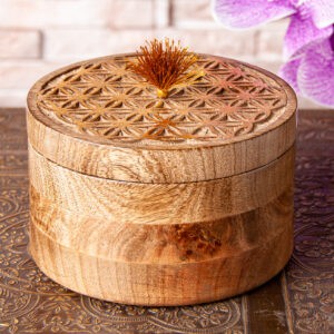 In dieser wunderschönen Holzschatulle im Shabby Chic Stil schützt und energetisierst du deine Schätze. Man kann darin wunderbar Schmuckstücke aufbewahren, Engelskarten oder andere Kostbarkeiten. Sie wurde in liebevoller Handarbeit aus Mangoholz geschnitzt. Die Lebensblume, das uralte Symbol für Schutz, Energie und Harmonie, wurde noch zusätzlich vergoldet und mit einer Quaste aus Kunstseide geschmückt. Eine sehr edle Aufbewahrungsmöglichkeit, die dennoch durch das Holz sehr natürlich wirkt.