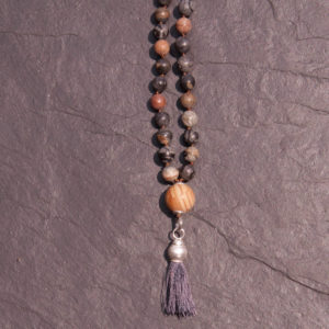 Der in dieser Gebets-Mala verwendete Picasso- Jaspis schaut aus wie ein Kieselstein und ist wunderschön weiss, grau, schwarz, beige und braun gemustert. Er passt wunderbar zu schlichten Outfits, ist aber genauso gut bei schicken Outfits ein besonderer Akzent. Diese Steine passen wirklich zu jedem Anlass und zu jedem Typ.