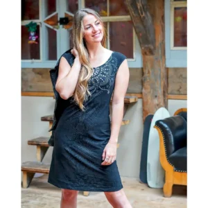 Die Farbe Schwarz steht für Seriosität, Glaubwürdigkeit, Ruhe und Wahrheit, während die goldenen Akzente den Reichtum deiner Seele ansprechen, den Gold ist die Farbe der Fülle. Das elegante Schwarz dieses Kleides in Kombination mit den dezent-verspielten und zugleich edlen Motive laden deine Seele ein, zu tanzen und in ihre weibliche Kraft zu kommen. Geniess das schöne Kleid und wie zauberhaft du darin wirkst!
